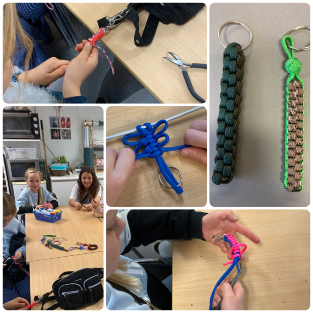 Efter Halloween gik vi i gang med at arbejde med faldskærmssnor. Ud af det kan man primært lave nøgleringe, men selvfølgelig også andre ting.