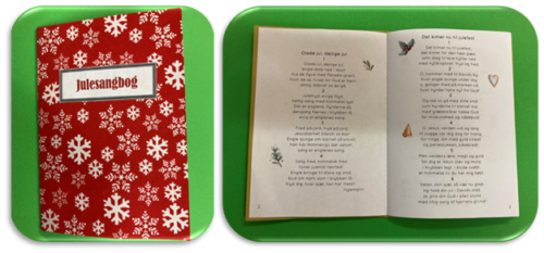 Børnene skulle selv lave omslag, skære tekstsiderne til, sy den sammen på midten og lave en lille label til forsiden. Ét barn nåede lige at lave et julesanghæfte, indtil der kom nogle Corona restriktioner på tværs.